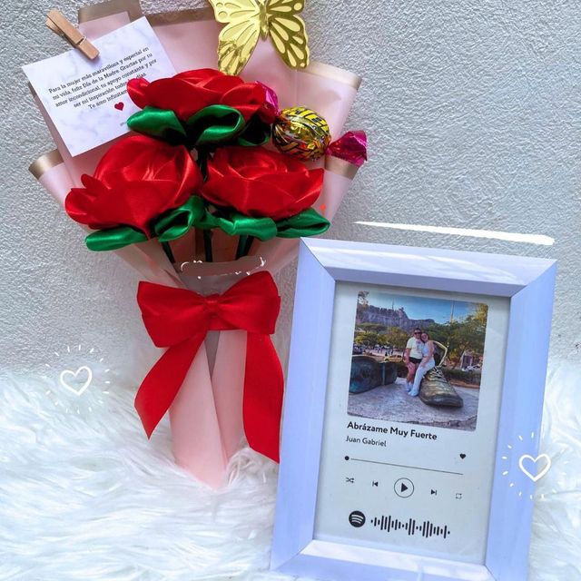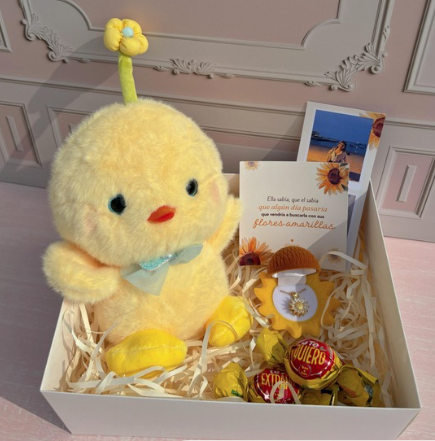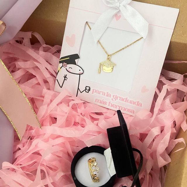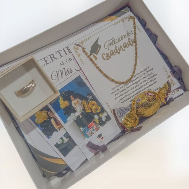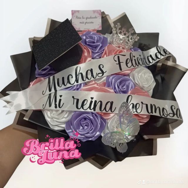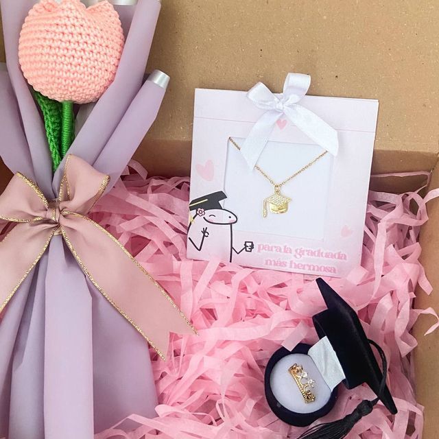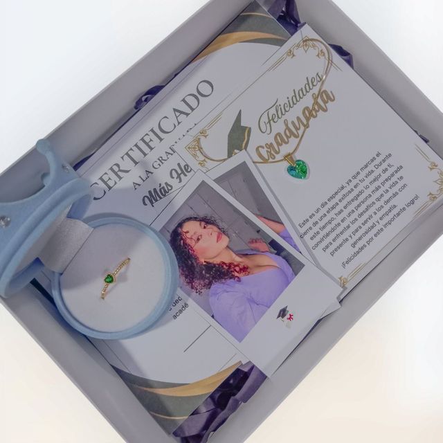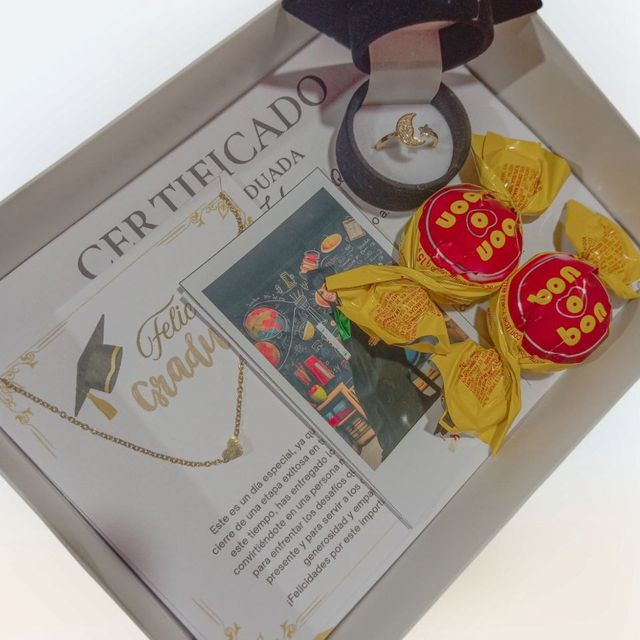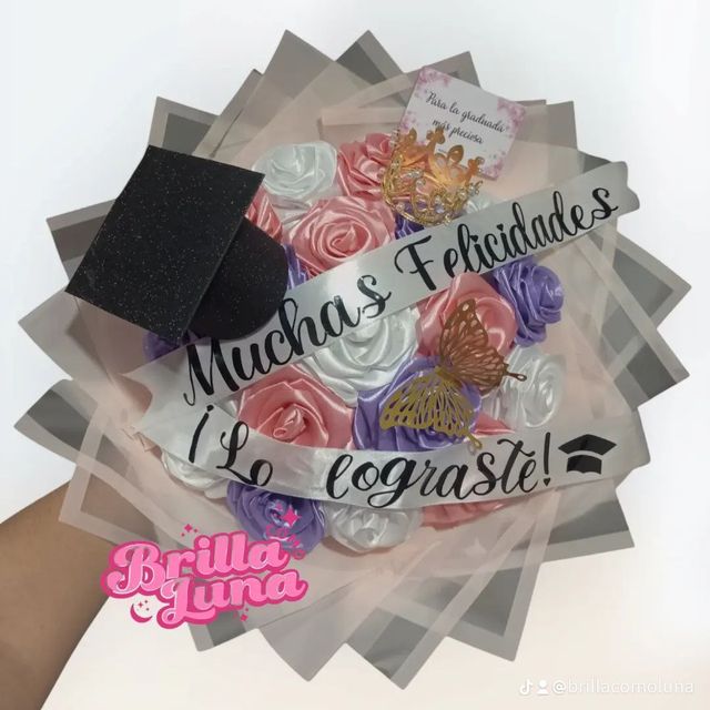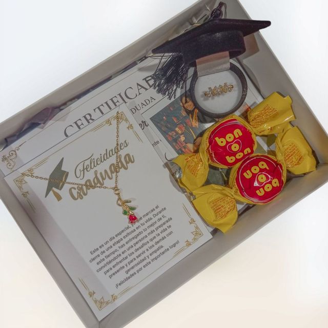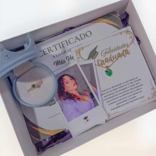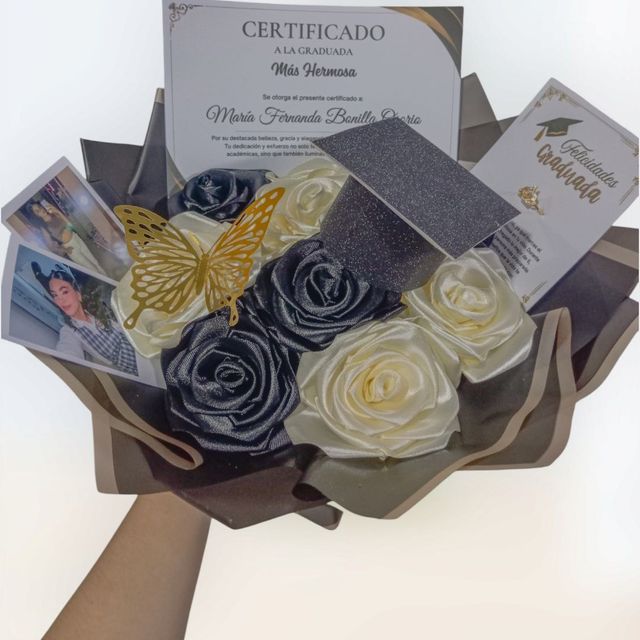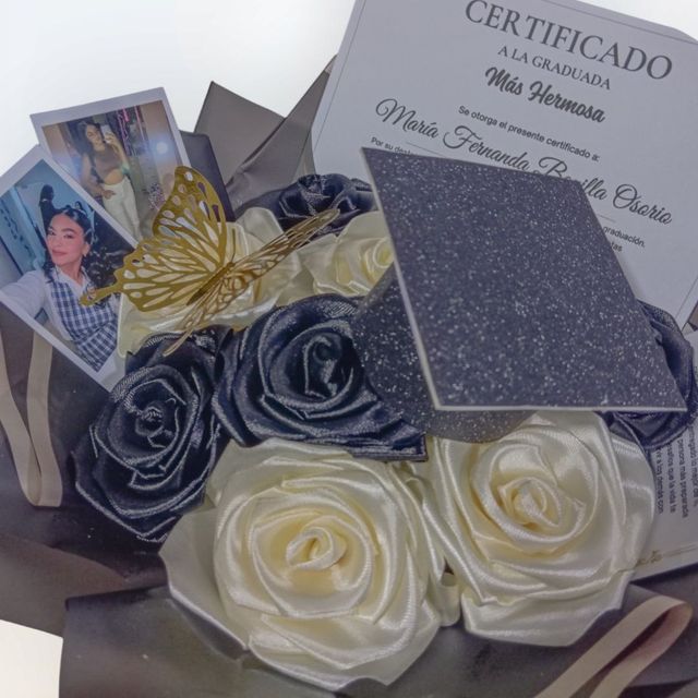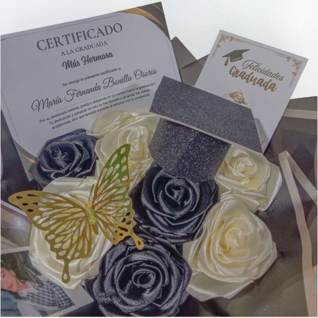 Incluye: - 8 rosas eternas - 1 birrete de grado - 1 mariposa - 2 fotos polaroid - 1 certificado de grado - 1 accesorio - 1 tarjeta - Decoración en papel coreano - Moño decorativo