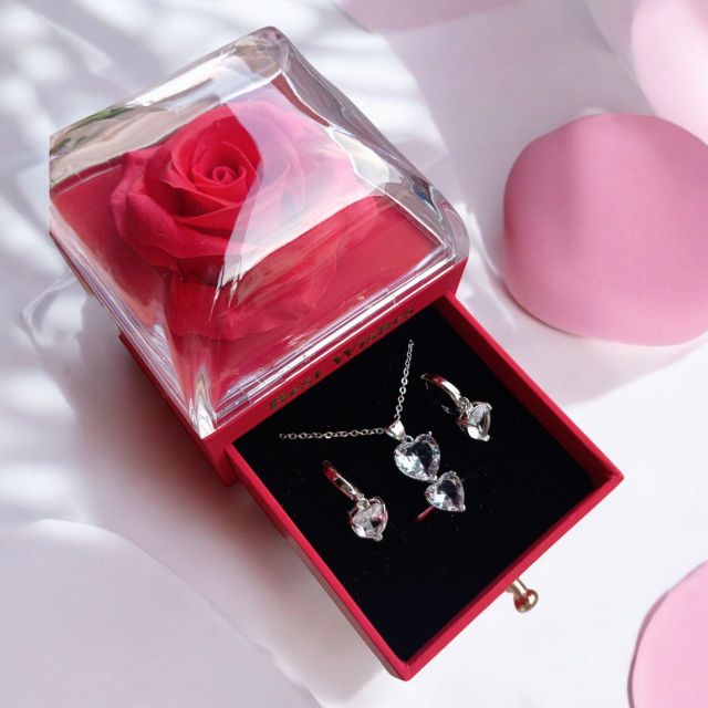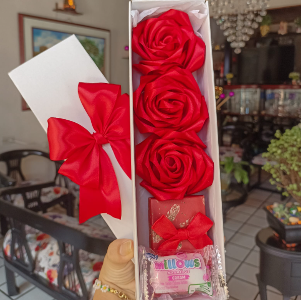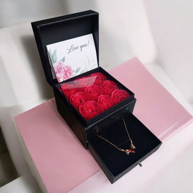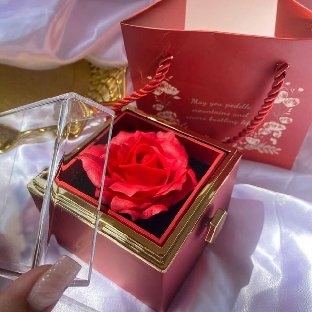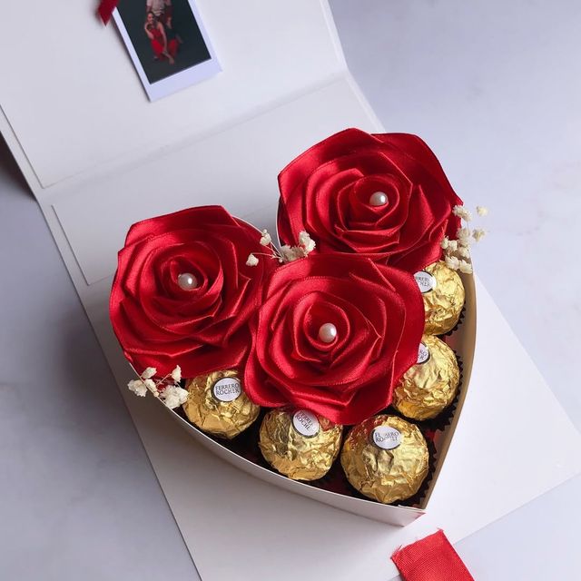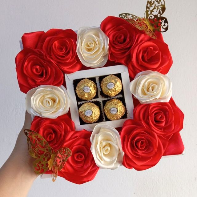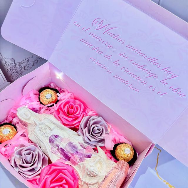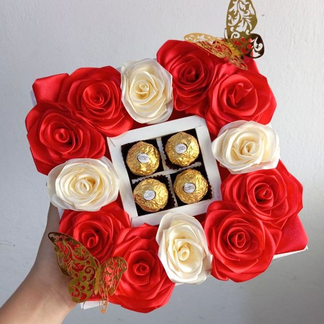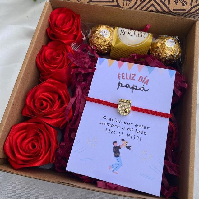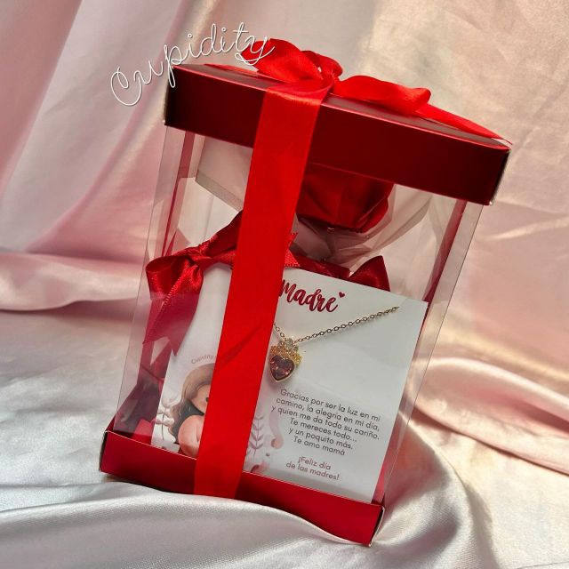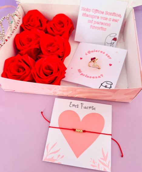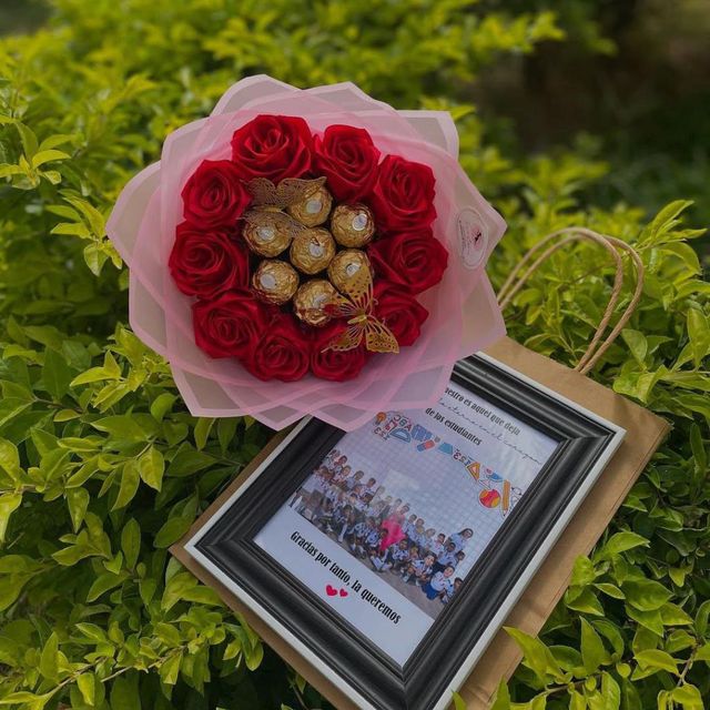 Incluye: - 6 rosas eternas - 4 chocolates ferreros - 1 burbuja personalizada - Moños decorativos