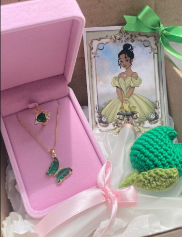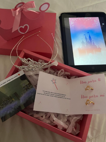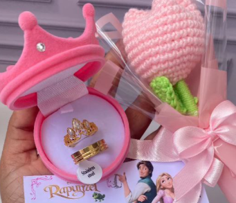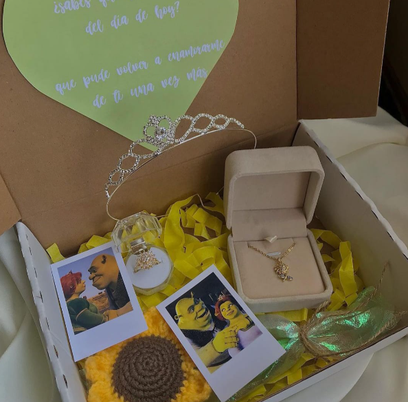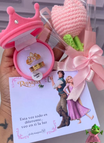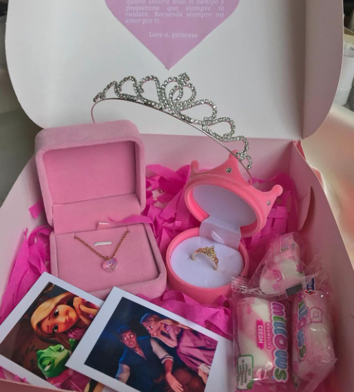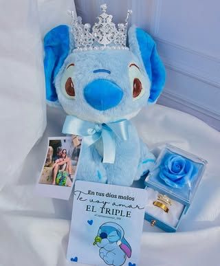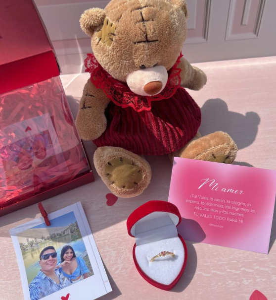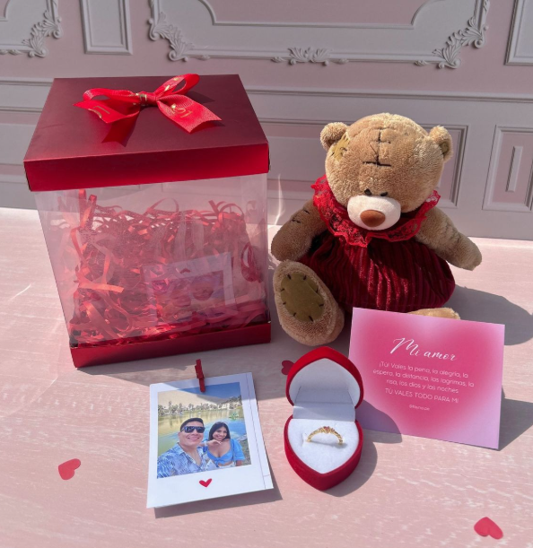 peluche, cofre de rosa, anillos, corona, foto polaroid