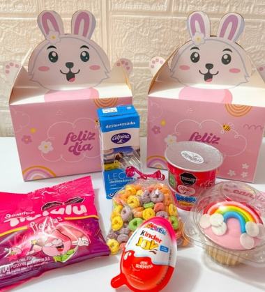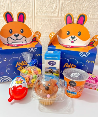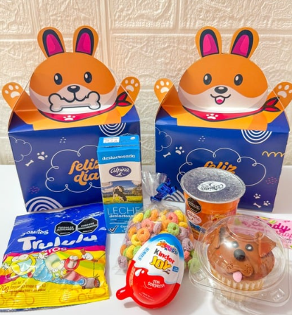 Jugo natural, mini nutella, sándwich, fruta picada, gomitas, tarjeta, caja decorada con mensaje personalizado