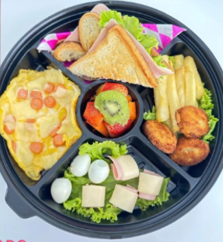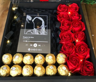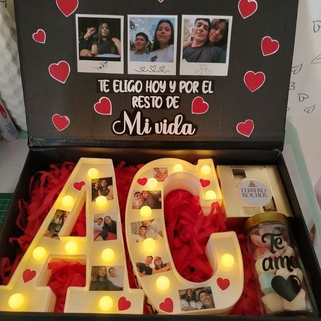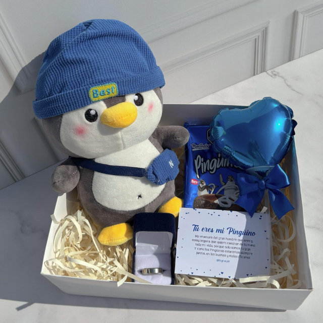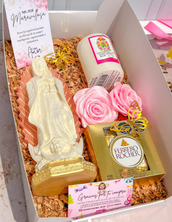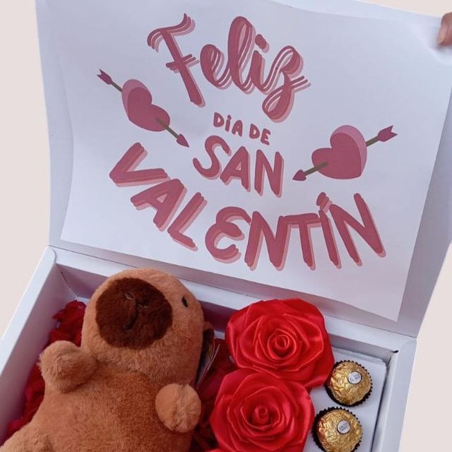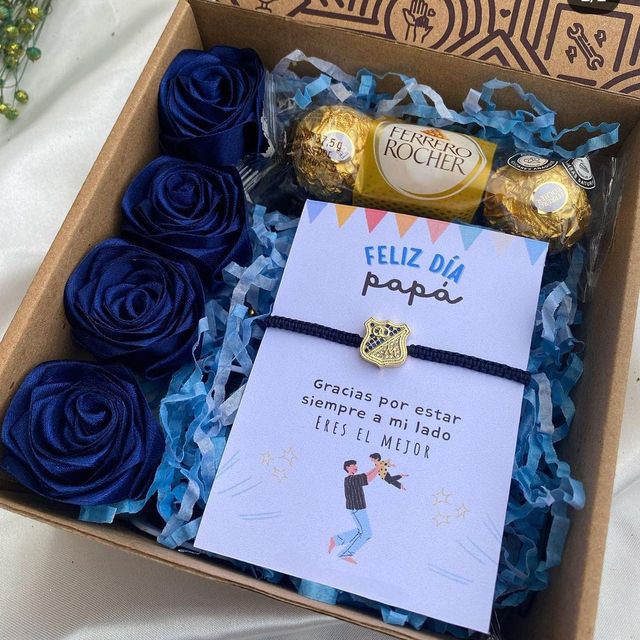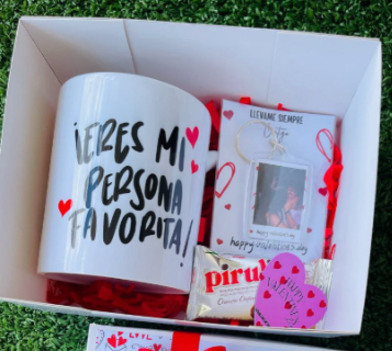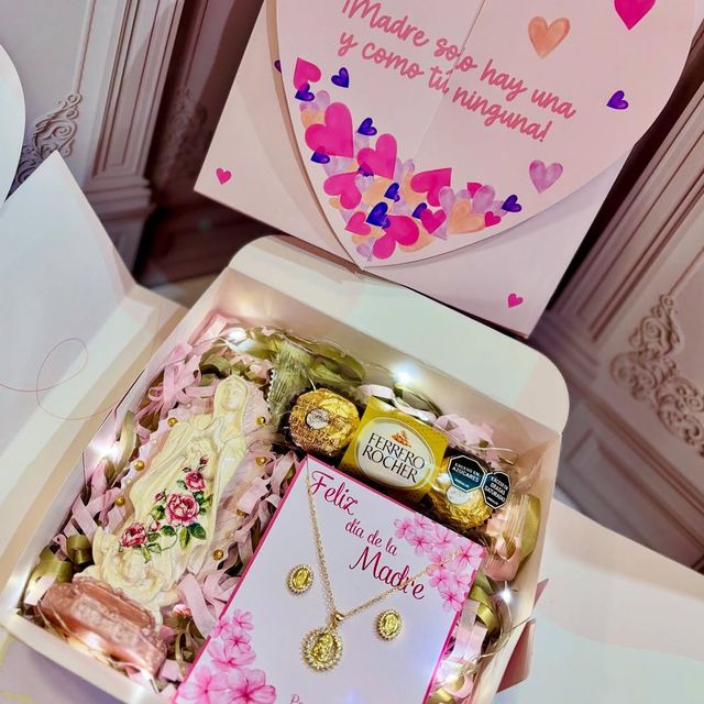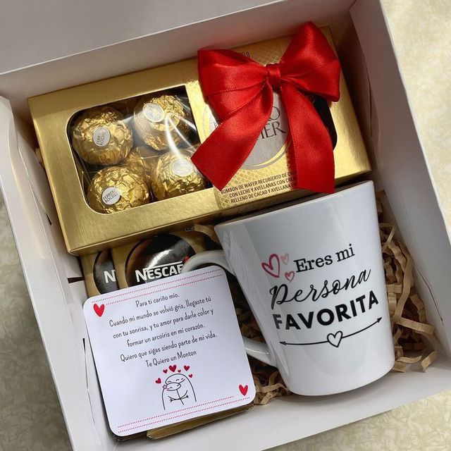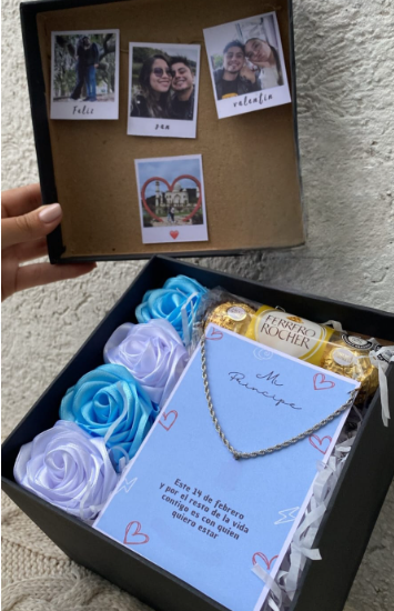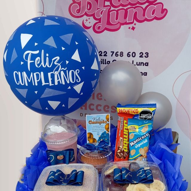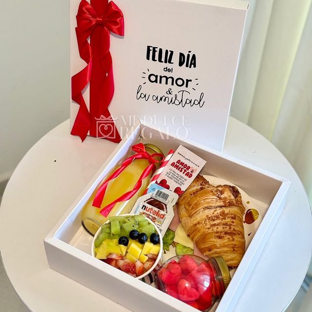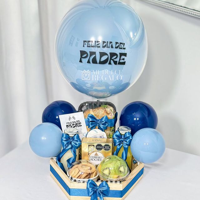 Incluye sándwich, jugo natural, café con leche, chocolate ferrero, fruta picada, galletas, globo con mensaje personalizado, caja de madera decorada.