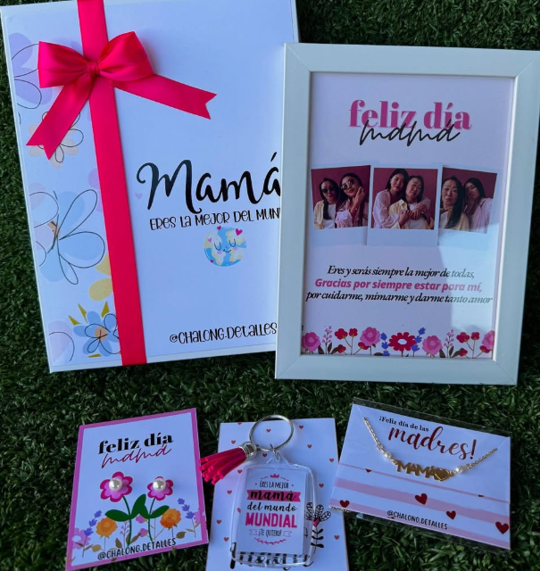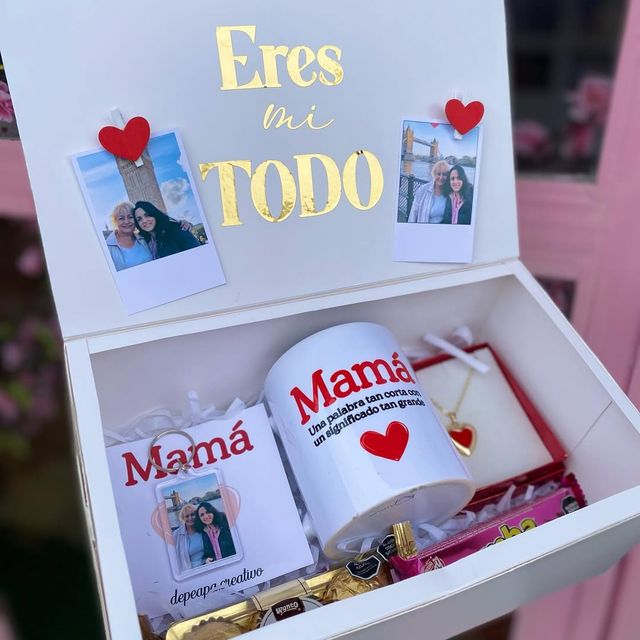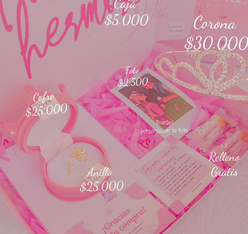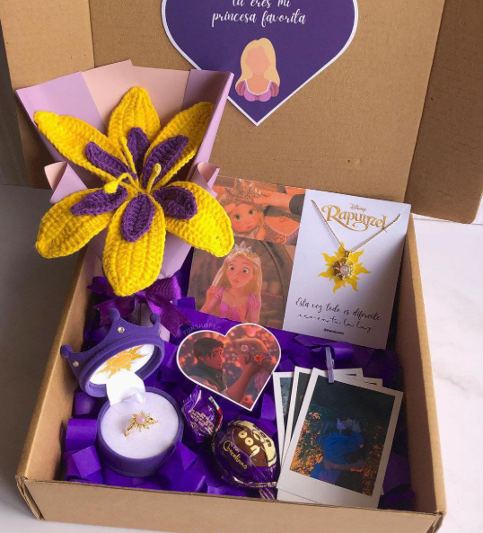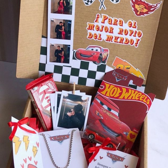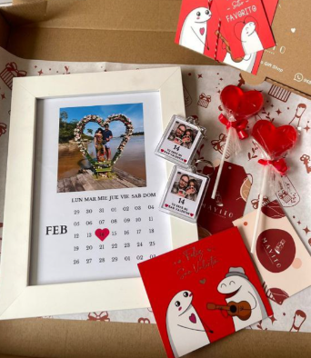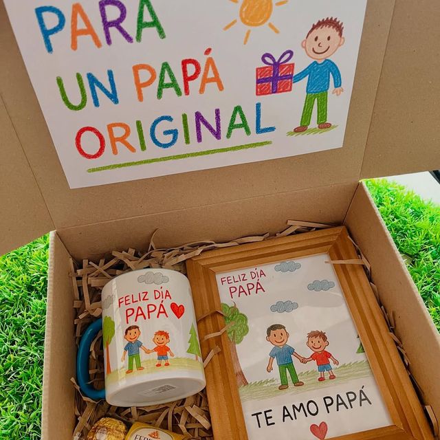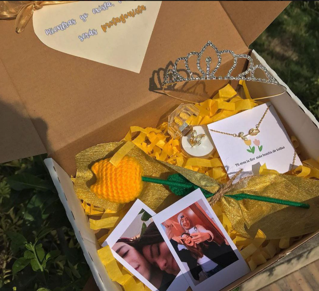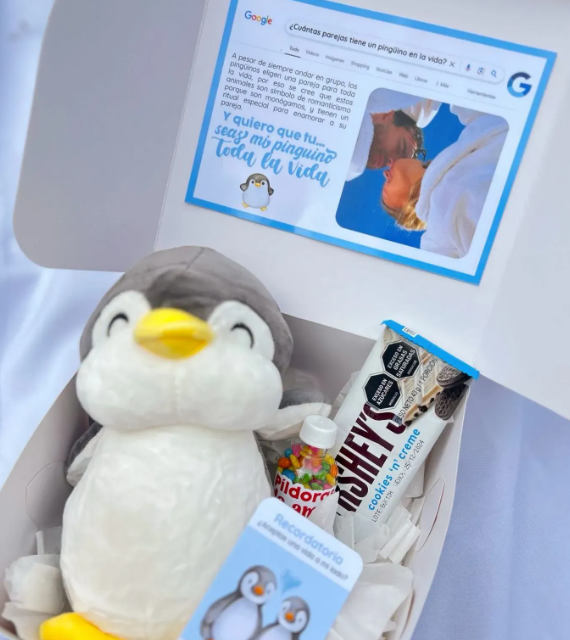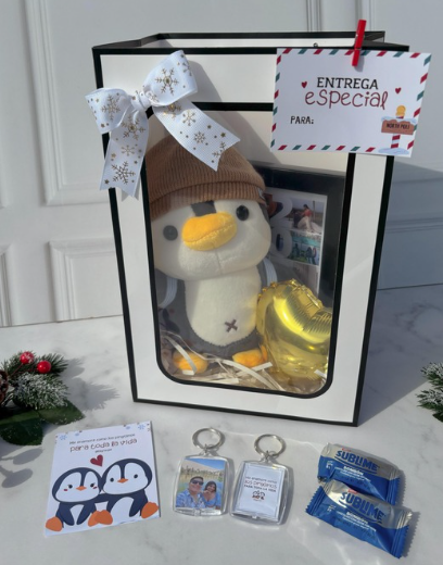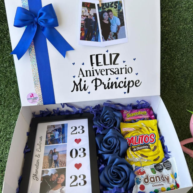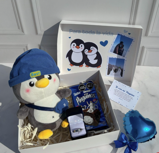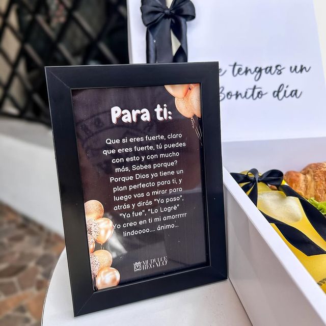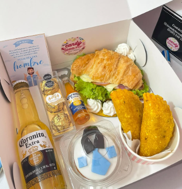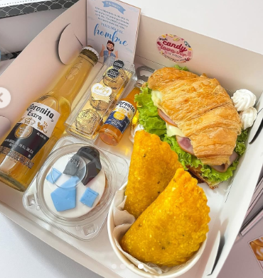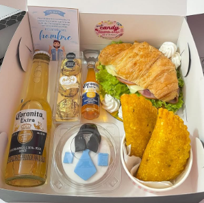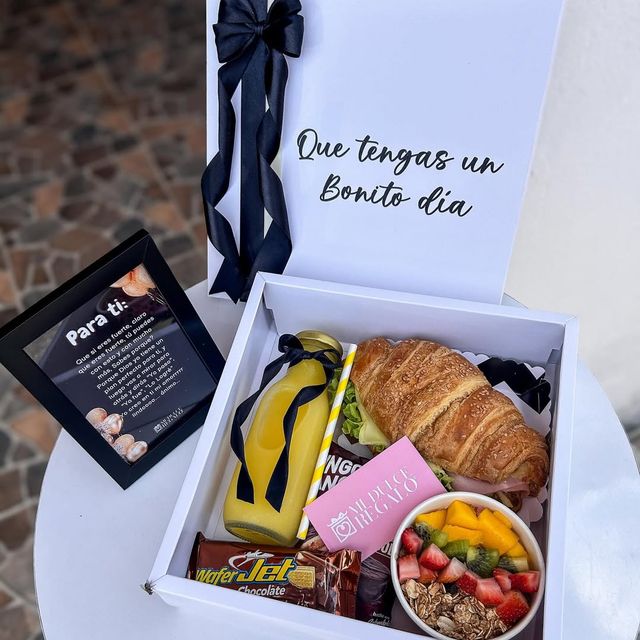 Incluye jugo natural, sándwich, fruta picada, galleta, brownie, mini portarretrato, caja decorada