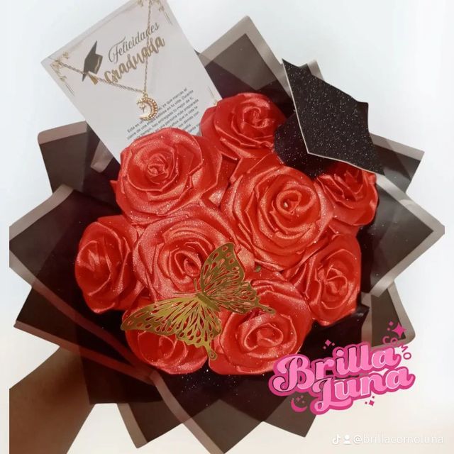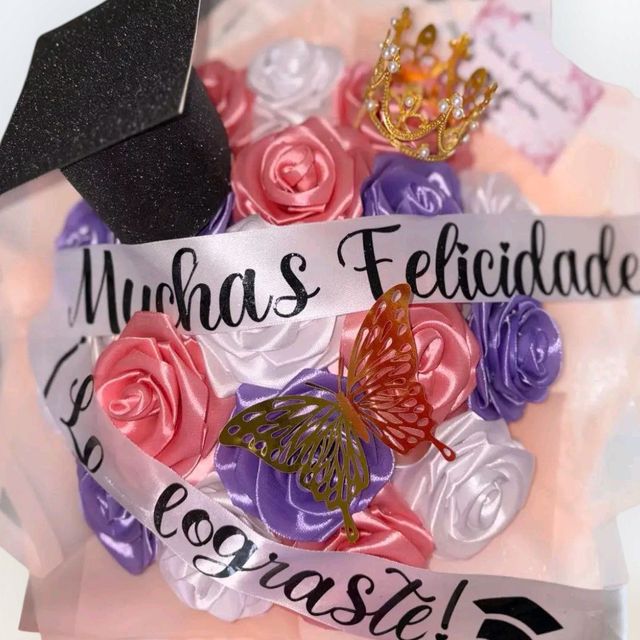 Incluye: - 8 rosas eternas - 1 birrete de grado - 1 mariposa - Decoración en papel coreano - Moño decorativo