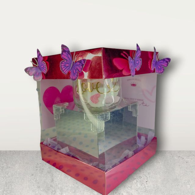 Caja decorada con lazo importado y mariposa 3D.