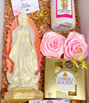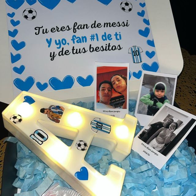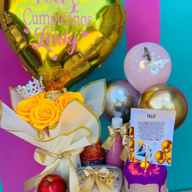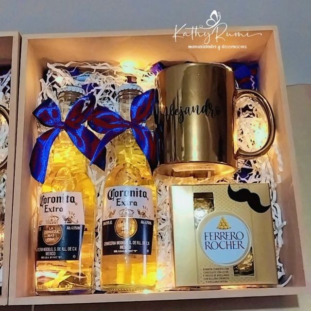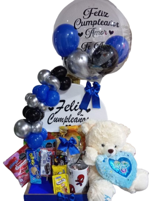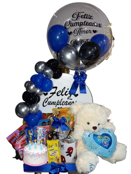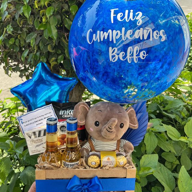 Incluye burbuja personalizada, un vasito personalizado, una cerveza, caja de 4 chocolates ferreros, una mini torta, dulces y peluche